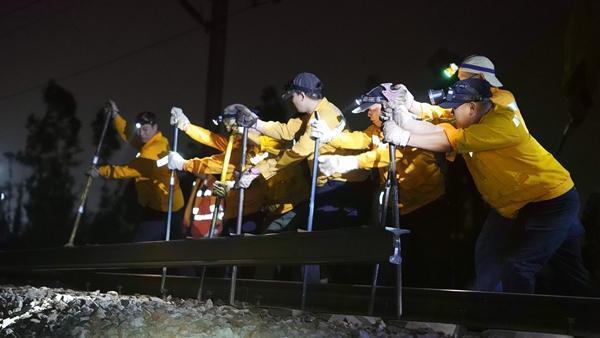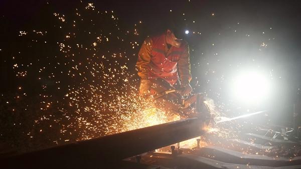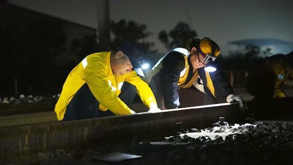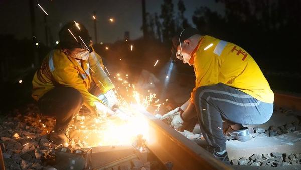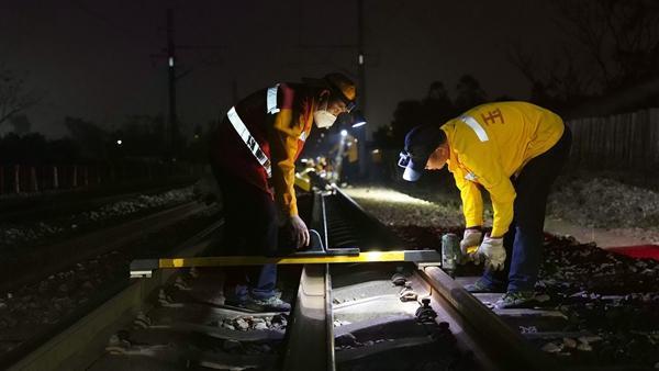 当晚凌晨1时14分,线路封锁命令下达,作业人员迅速响应,头戴头灯奔赴作业现场,寂静的夜空瞬间被机械轰鸣声打破。扣件组职工手持电动扳手,精准松卸每一颗螺栓,清脆的金属碰撞声划破夜晚;锯轨组熟练操控专业设备切割旧轨,飞溅的铁屑在灯光下划出金色弧线,成为寒夜里最美的风景。