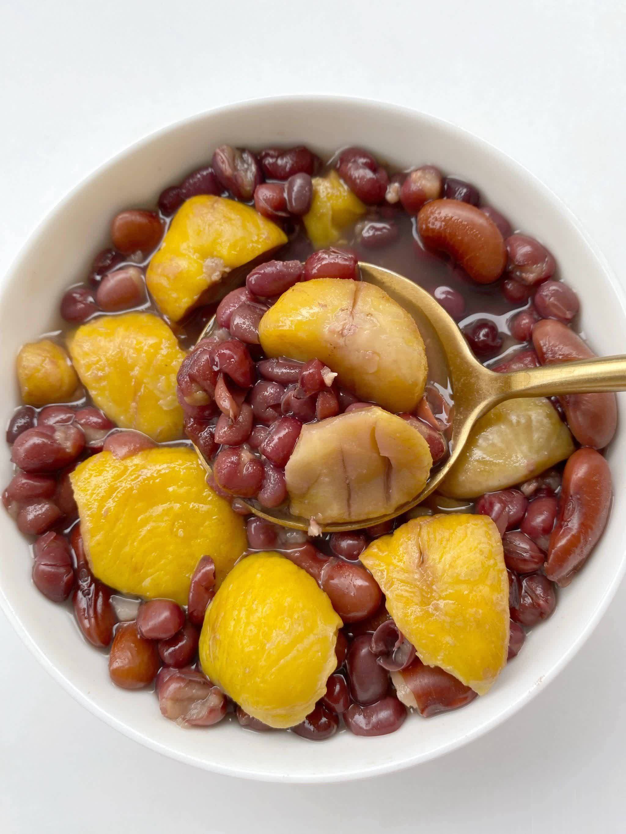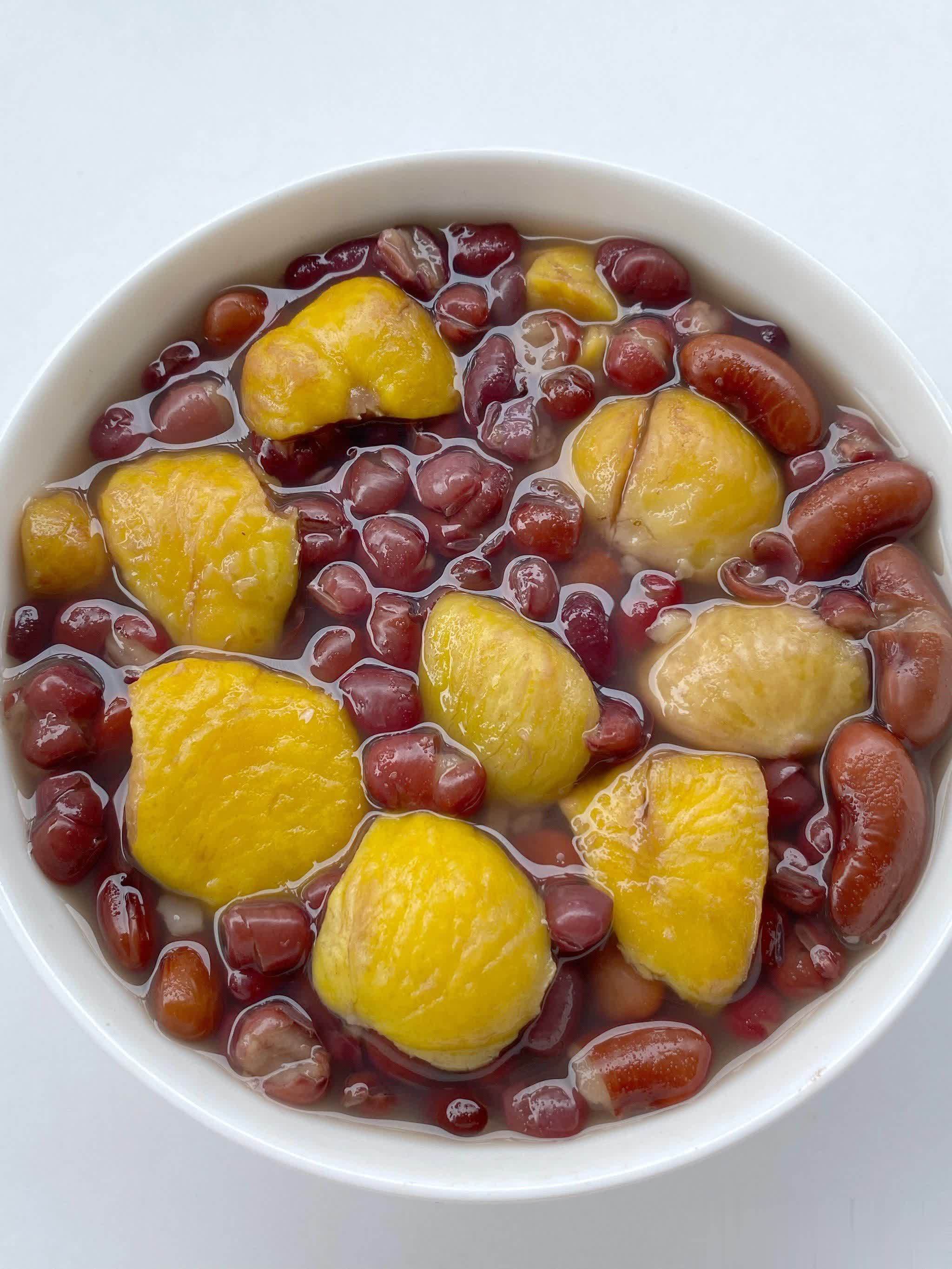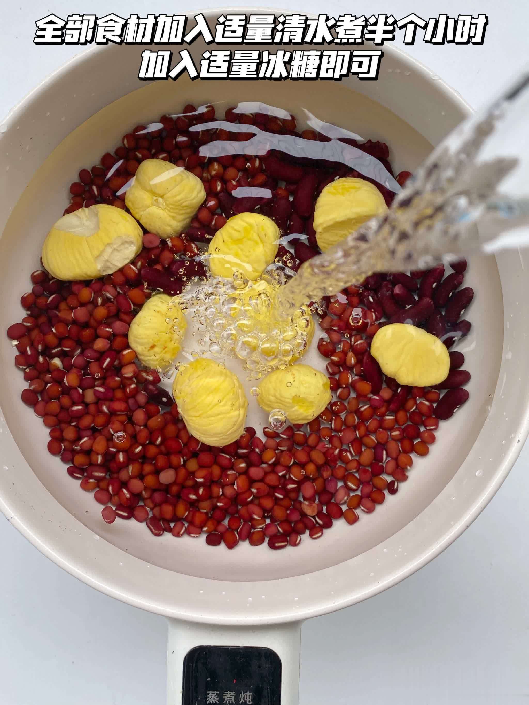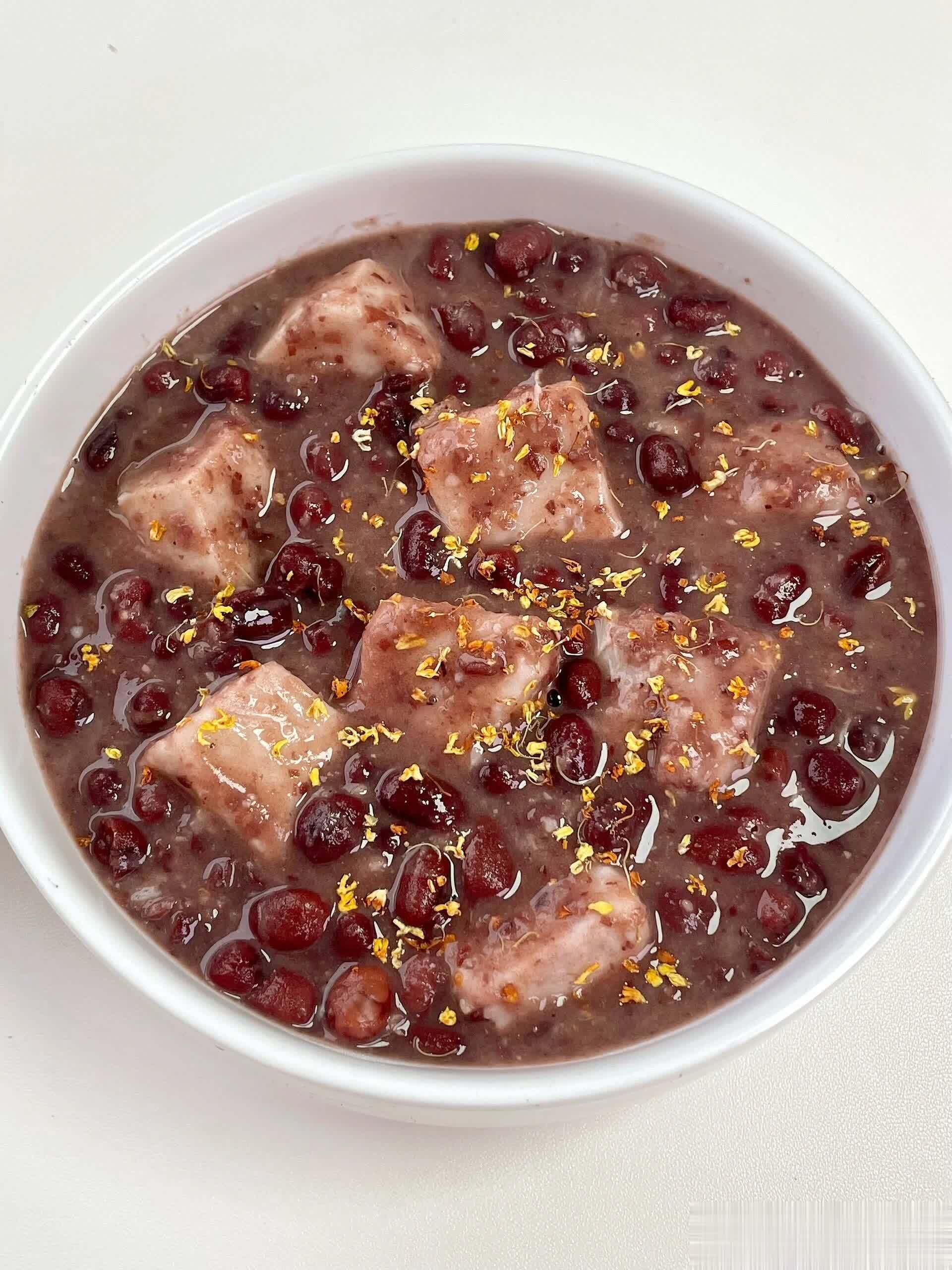 1. 红豆提前用清水浸泡4小时,放入锅中加足量水,大火煮开后转小火煮30分钟,至红豆软烂,加冰糖调味后捞出备用。