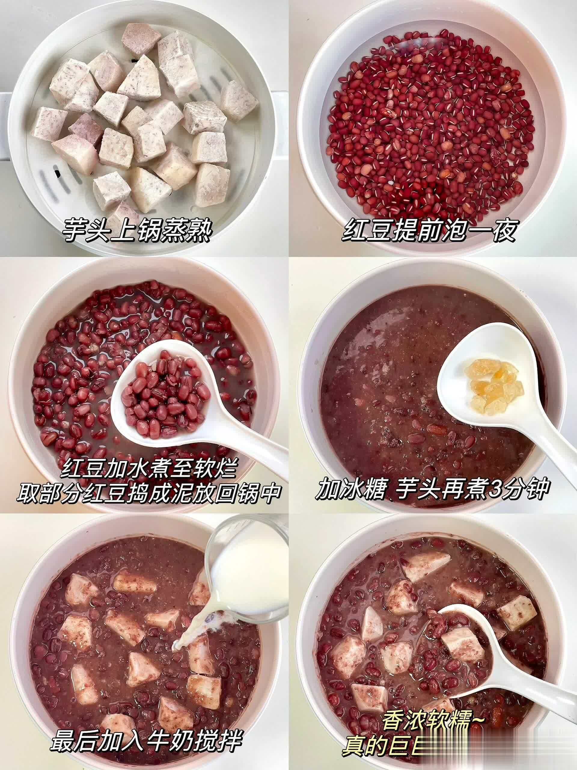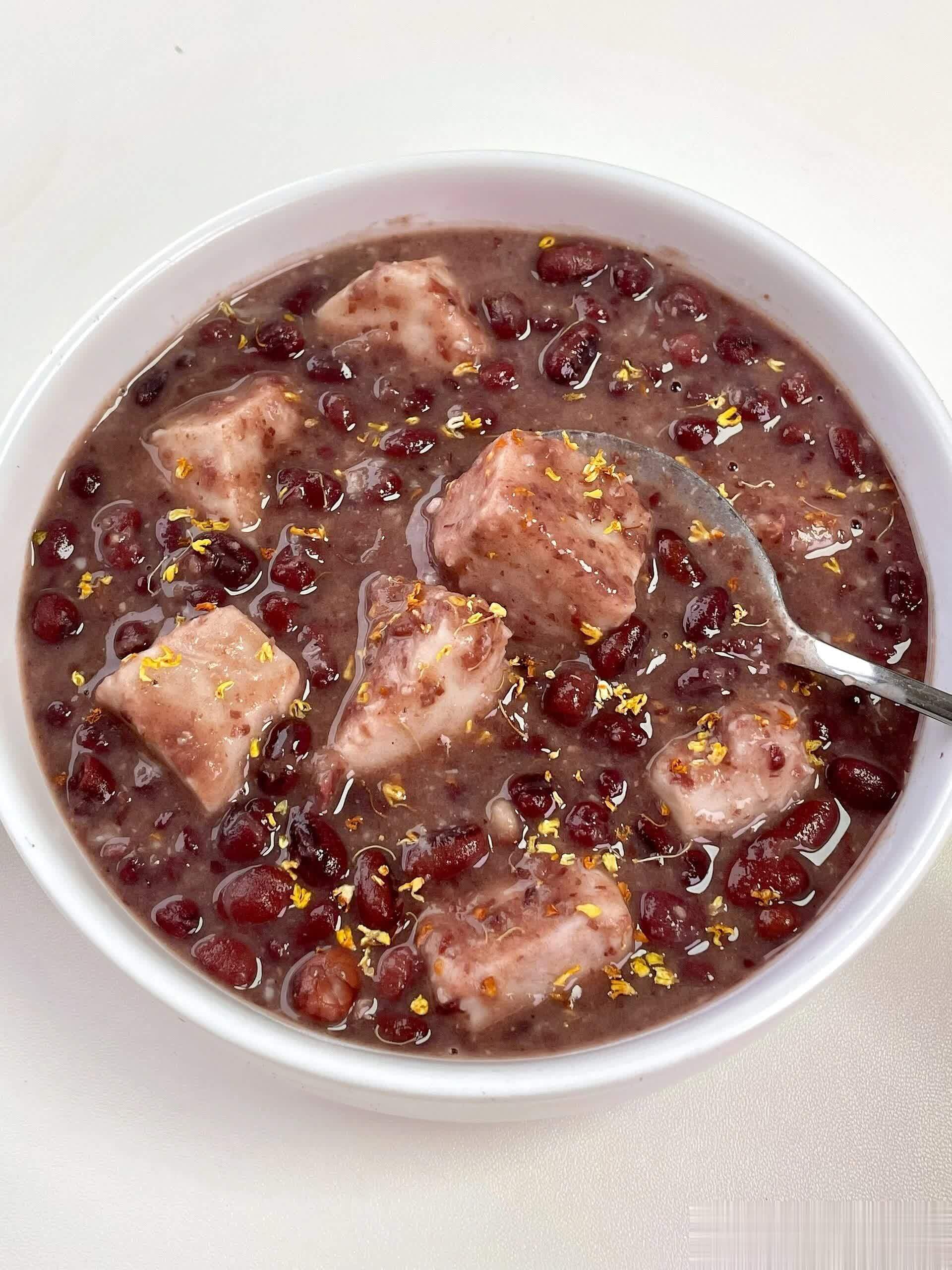 3. 加入芋头块,继续煮15分钟,至芋头和红豆都软烂。