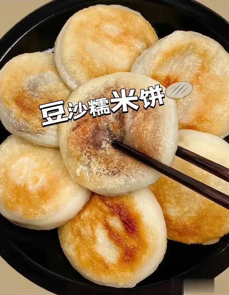 4. 平底锅刷一层薄油,小火加热,放入红豆糯米饼,煎至两面金黄、微微鼓起即可。