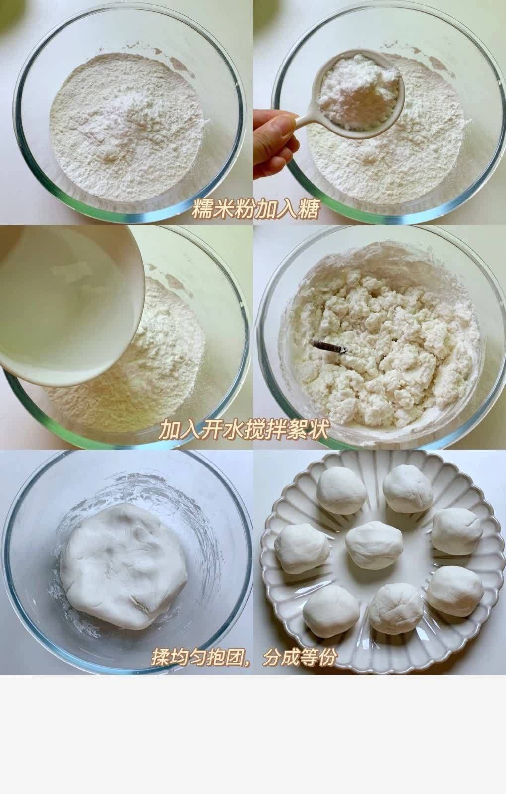 2. 糯米粉中加适量温水,揉成光滑不粘手的面团,分成6个大小均匀的小剂子。