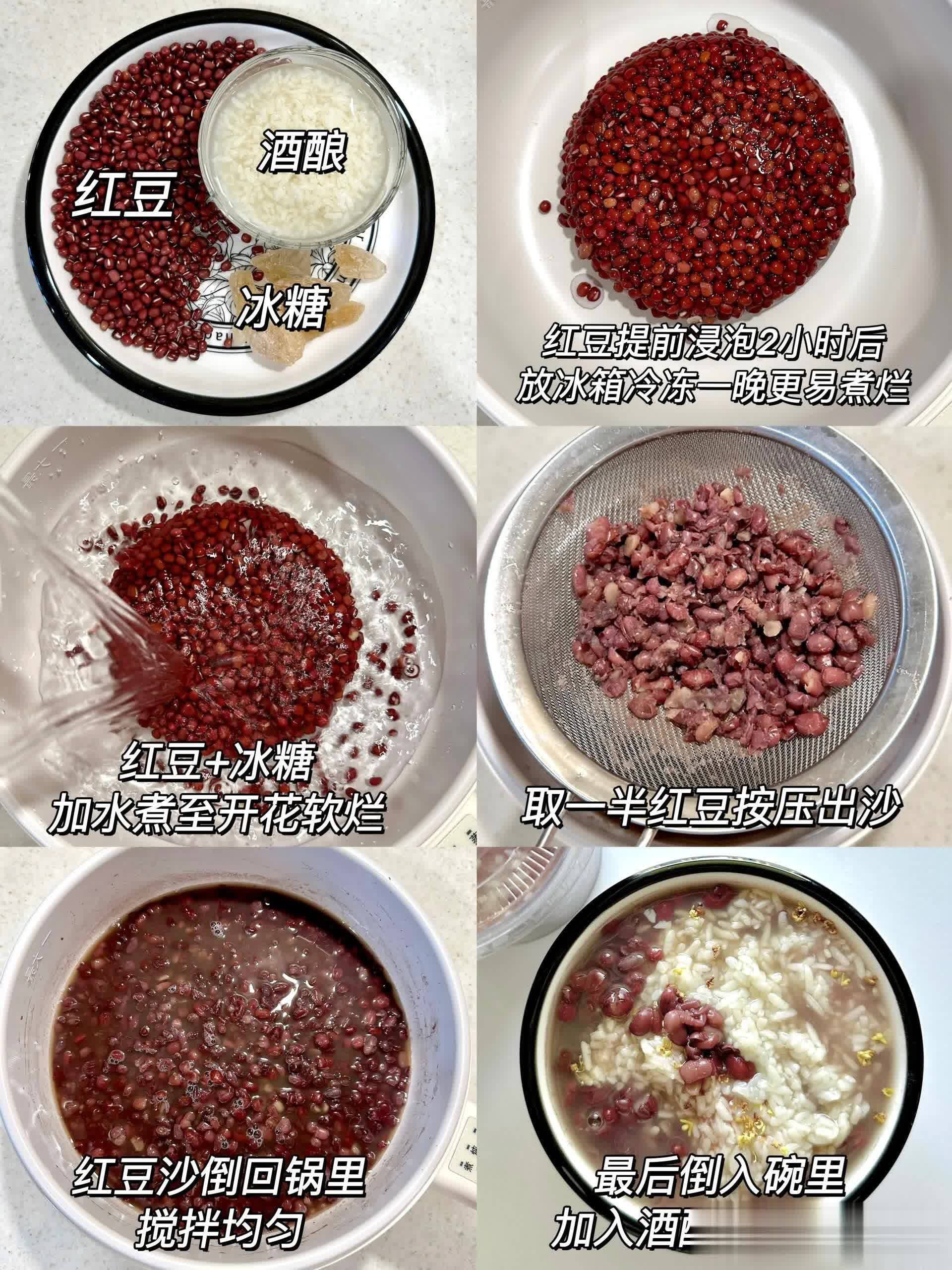 5. 取适量发酵好的酒酿,加入煮好的红豆和清水,小火煮5分钟即可。