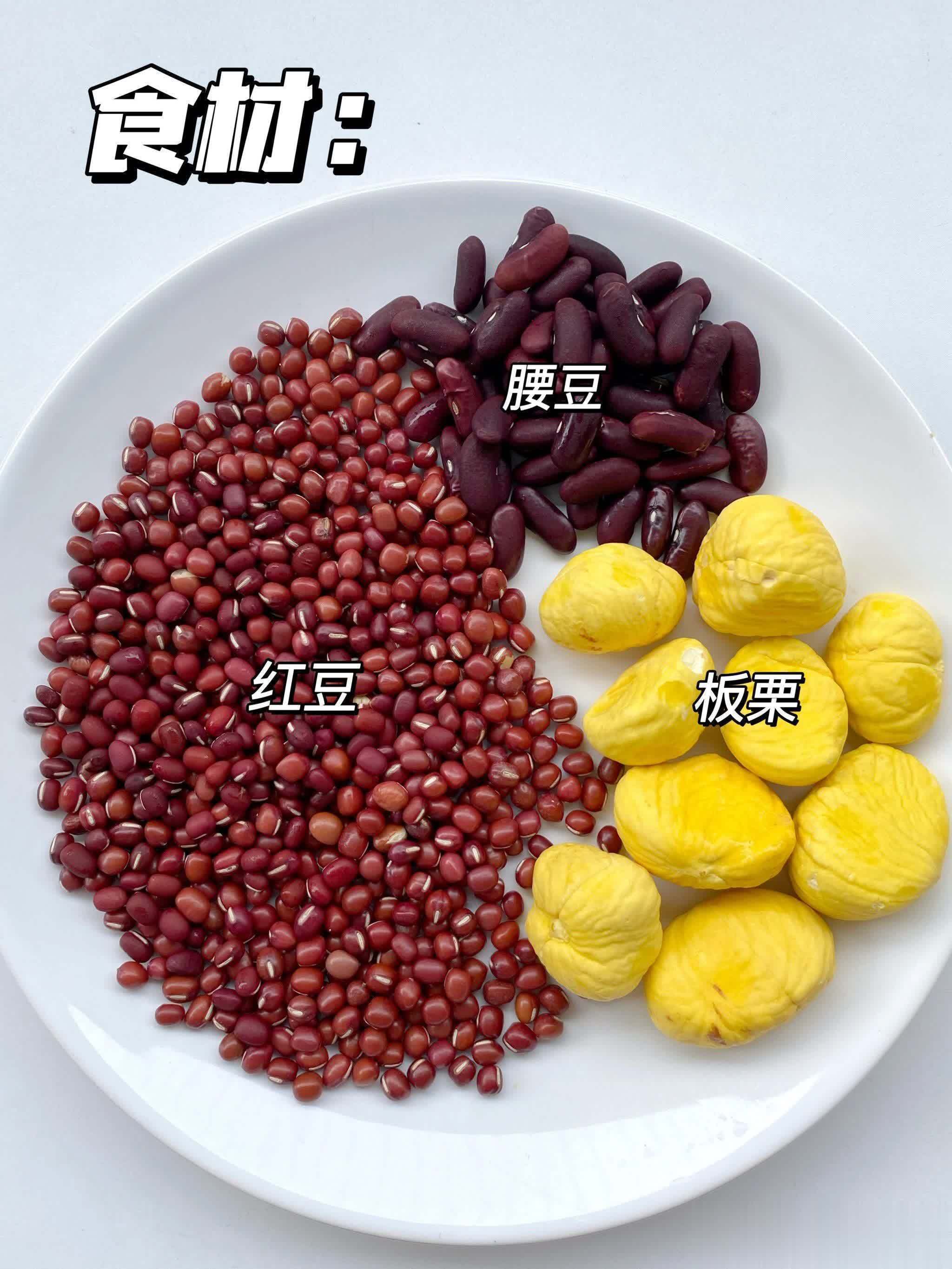 1. 红豆和大米分别淘洗干净,浸泡30分钟;板栗去壳去皮,切成小块备用。