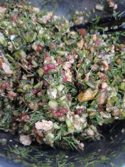 麦蒿吃油,和五花肉是绝配。调馅时先拌油再放盐,能锁住野菜的水润。上次包包子,邻居闻着香来敲门,尝了半个非要学做法——三分肥七分瘦的肉馅打葱姜水,麦蒿碎拌上香油先腌着,临包前兑一块,蒸出来汤汁把面皮都浸得半透明。