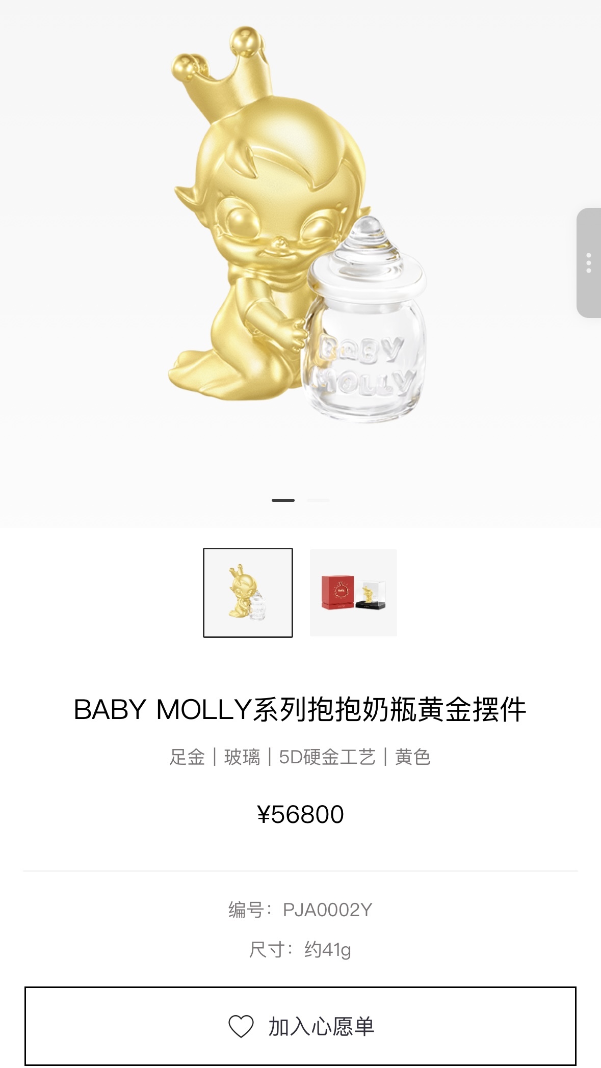 日前,泡泡玛特旗下珠宝品牌popop官宣首次推出IP Molly系列的足金产品。包括黄金串珠、吊坠、金条和摆件,价格分布在980-56800元之间。其中价格最贵的是重约41g的黄金摆件,售价超5万元。
